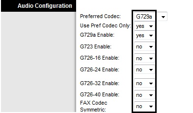 Establezca en YES: Preferred Codec, Use Pref Codec Only y G729a Enabled, resto de codecs en NO: